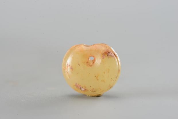 劉家窪芮国遺跡の「M3」墓から出土した円形凹口玉飾。(西安=新華社配信)