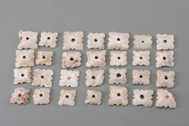 劉家窪芮国遺跡の「M3」墓から出土した方形蚌泡(ほうほう=装飾具)。(西安=新華社配信)